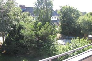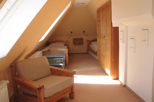 Zur Obergeschoßwohnung gehört ein Balkon sowie ein zusätzliches, geräumiges Zimmer im ausgebauten Dachgeschoss. Die insgesamt etwa 75 qm große Wohnfläche bietet Platz für 4 + 2 Personen.